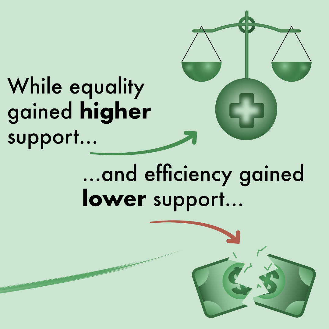 Image 5 – Results: At this point, it becomes tricky to progress the story without using too many slides. Remember, it’s social media and the viewers’ attention span is severely limited. Thus, results must be effectively presented in an engaging way, keeping the conflict alive. As always, the researcher must decide which results to focus on. I decided to focus on 2 results, that support for equality increased and support for efficiency decreased, reusing illustrations for these two concepts from before.
