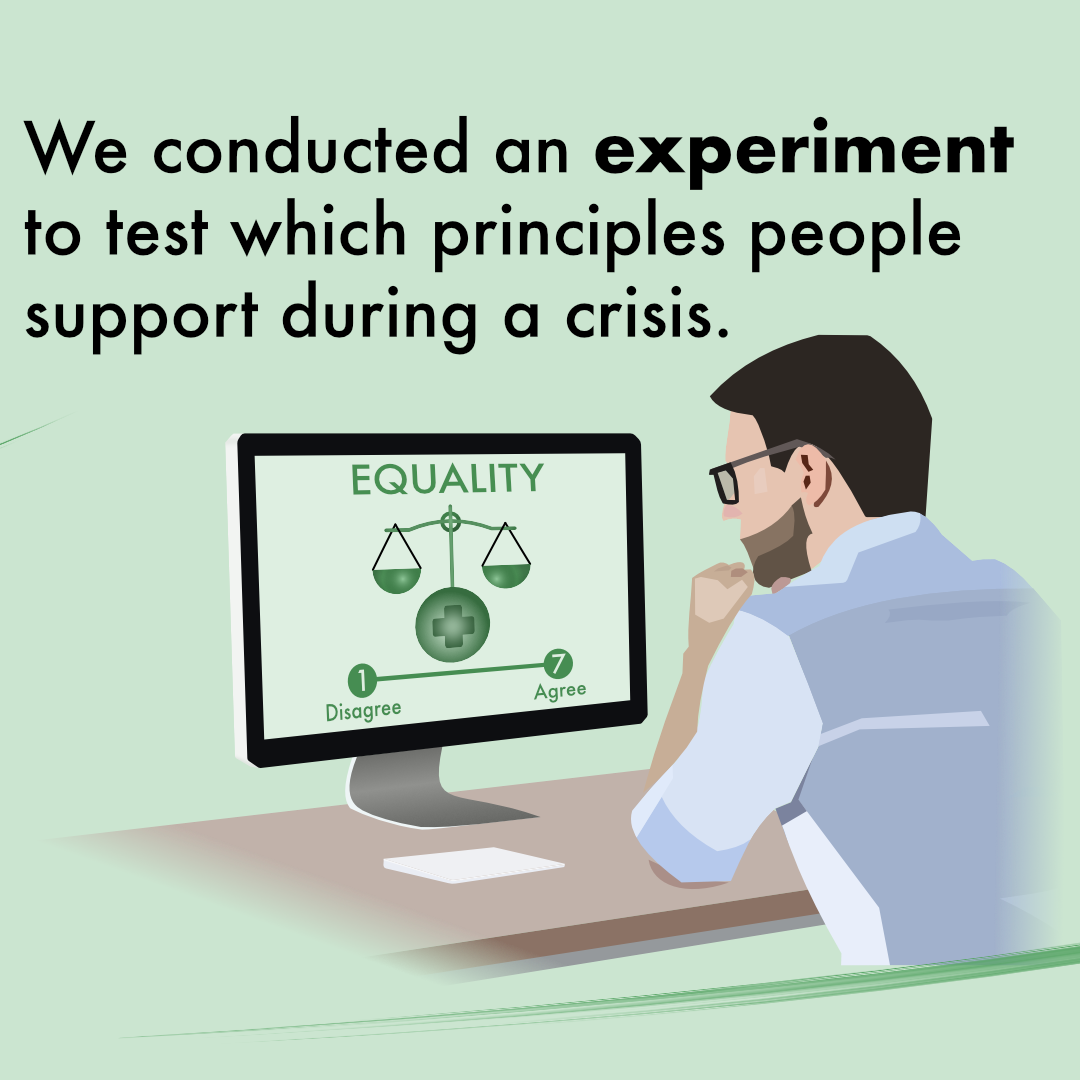 Image 4 – The experiment solution: The story continues with a therefore. To try resolving the conflict, we conducted an experiment to test which principles people support during a crisis. The illustration clarifies that i) it’s an online experiment and ii) that a 7-point Likert scale is used to measure support for an ethical principle, such as “equality”.