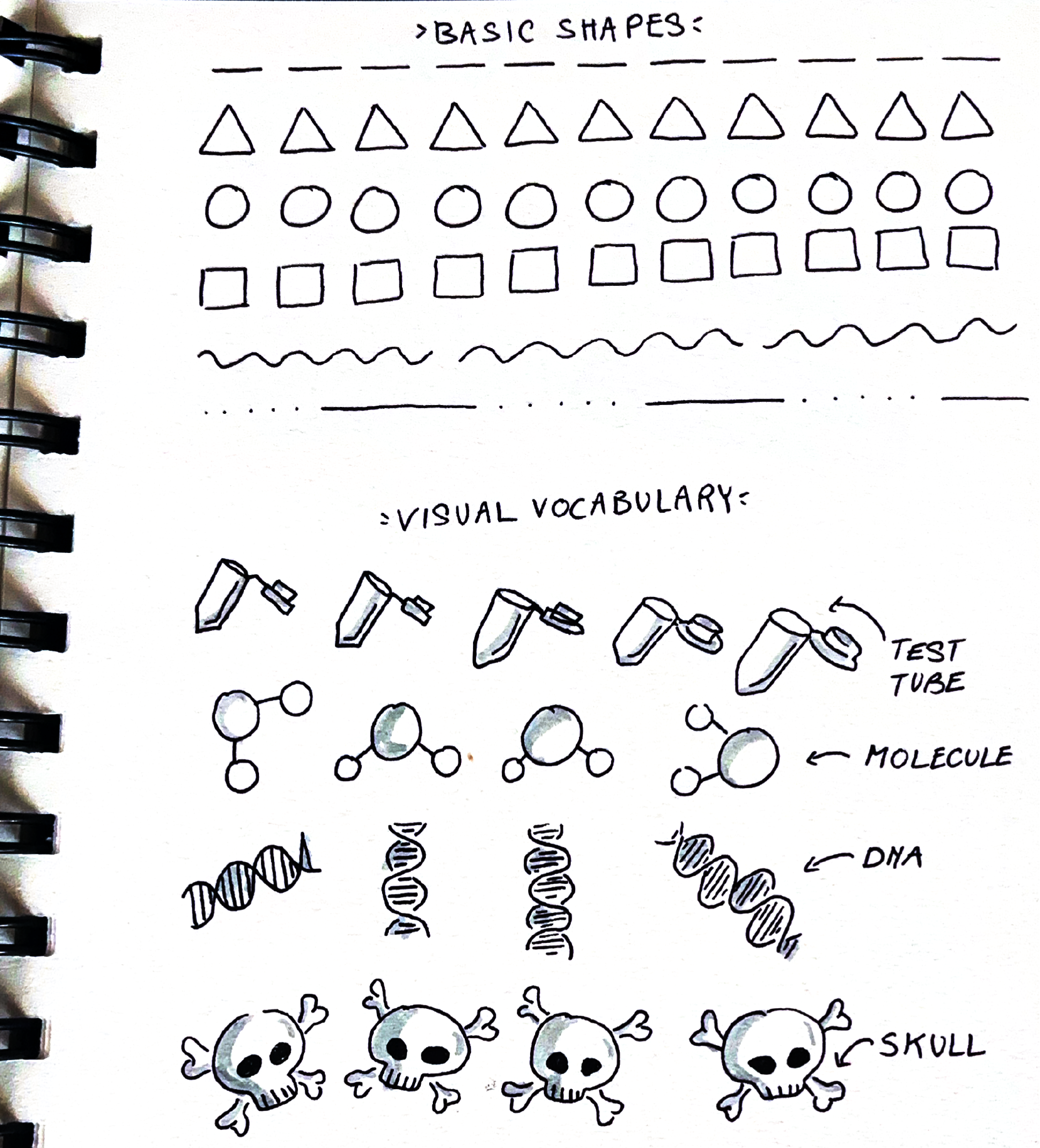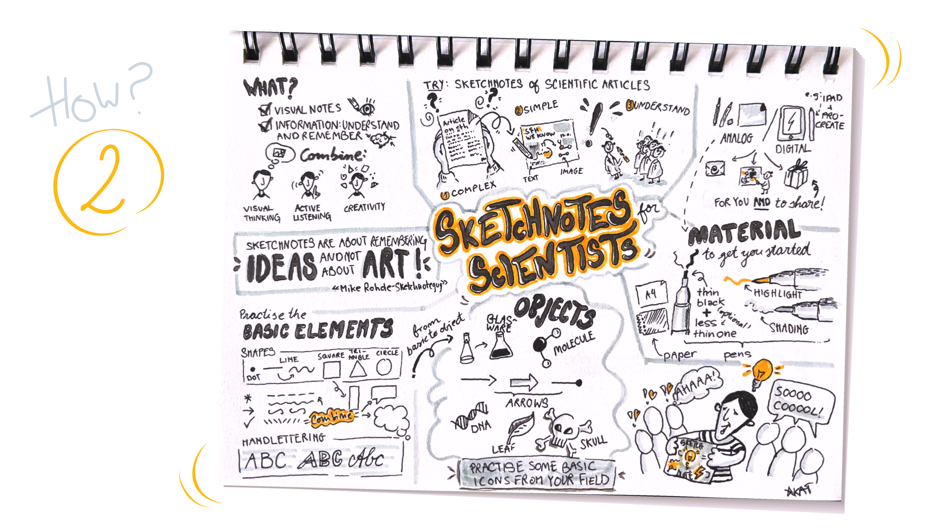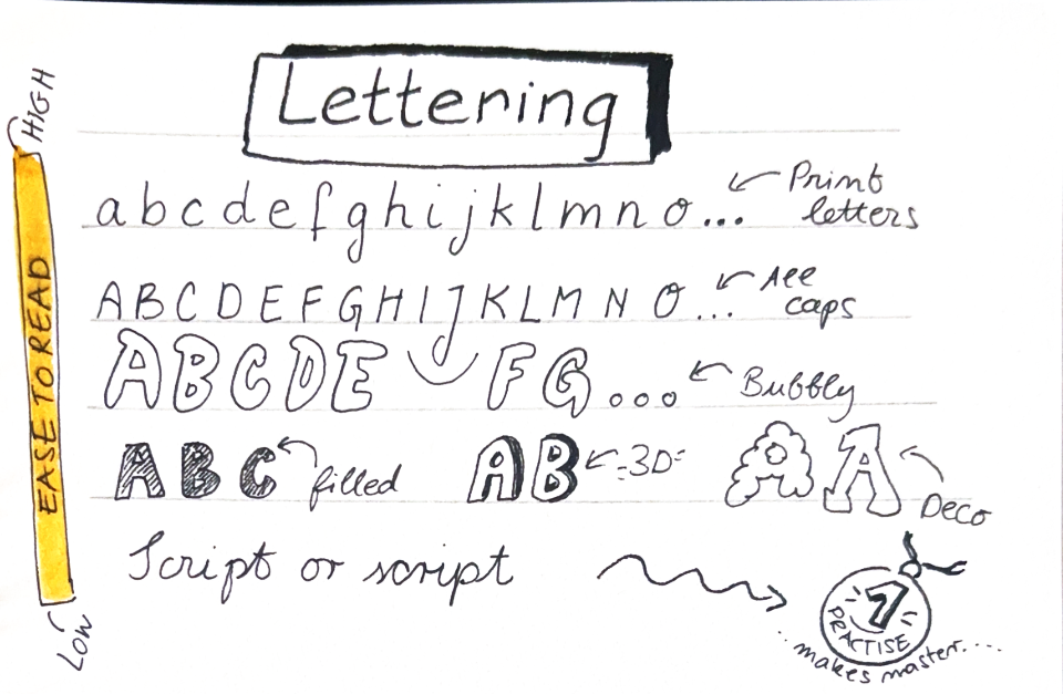 Before diving into full sketchnotes, it is useful to practise and build some basic skills. And if you doubt your drawing skills, don't worry, sketchnoting is less about artistic talent and more about clear visual communication. The exercises I suggest here help you focus on drawing, hand-lettering, and layout. That way, when you work on your sketchnotes, you can fully focus on content and less on the technical realization of the drawings.