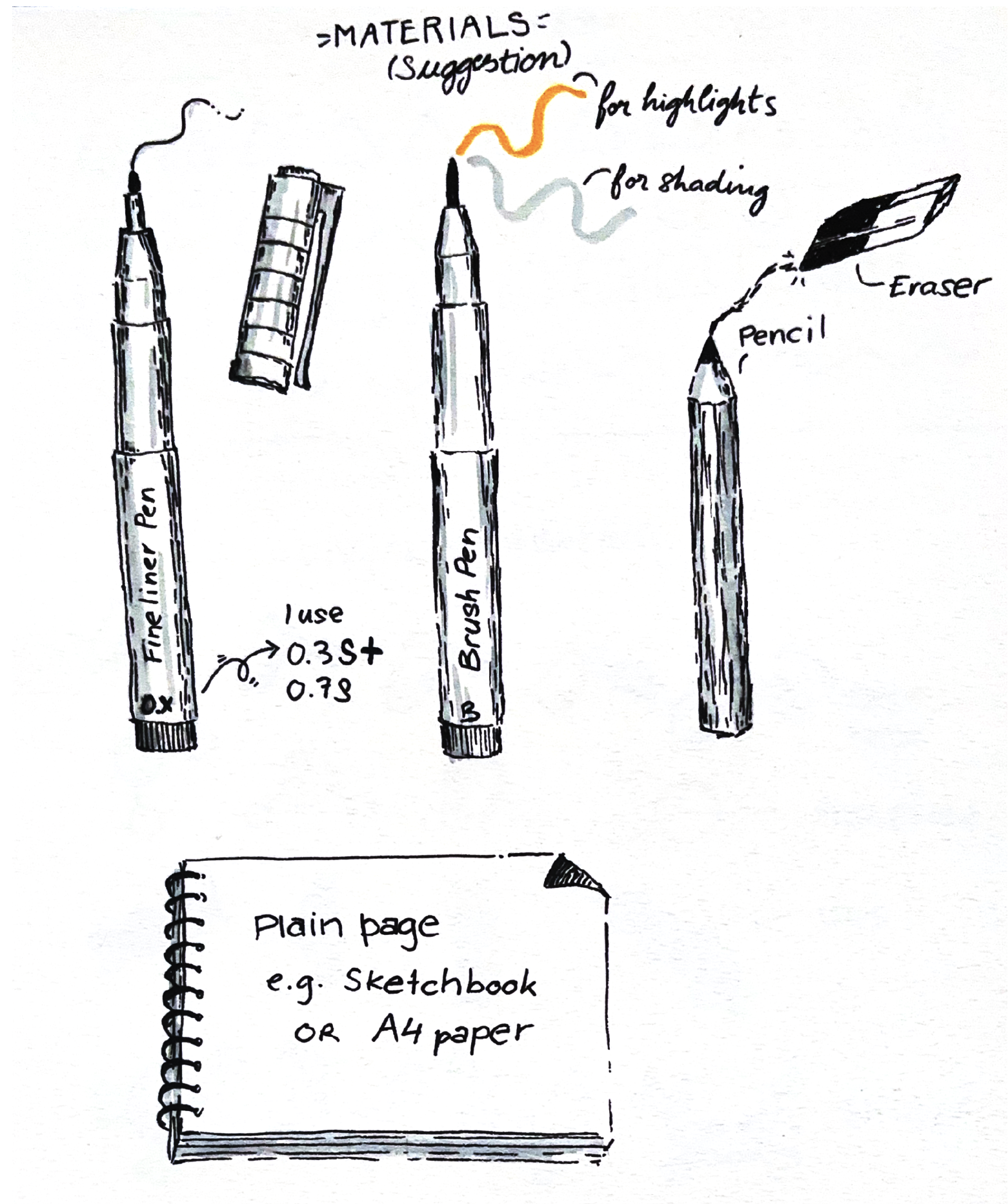 - Optional, but a nice-to-have: a grey (brush) pen for shading