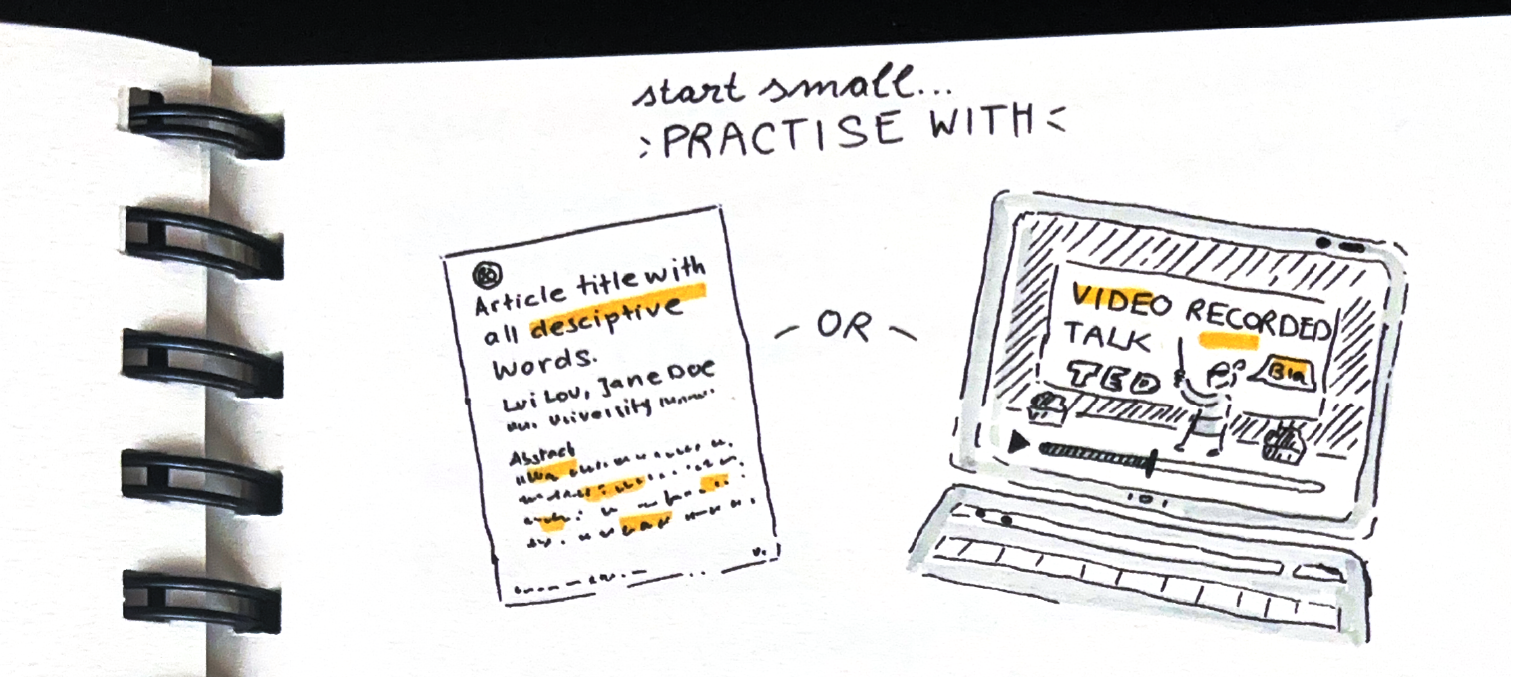 One good practice is to pick a video of a talk, for instance, a TED talk on an interesting topic could be a fun start. Or maybe the easiest is to pick a title and abstract from an interesting article. Listen or read through once, then pause.