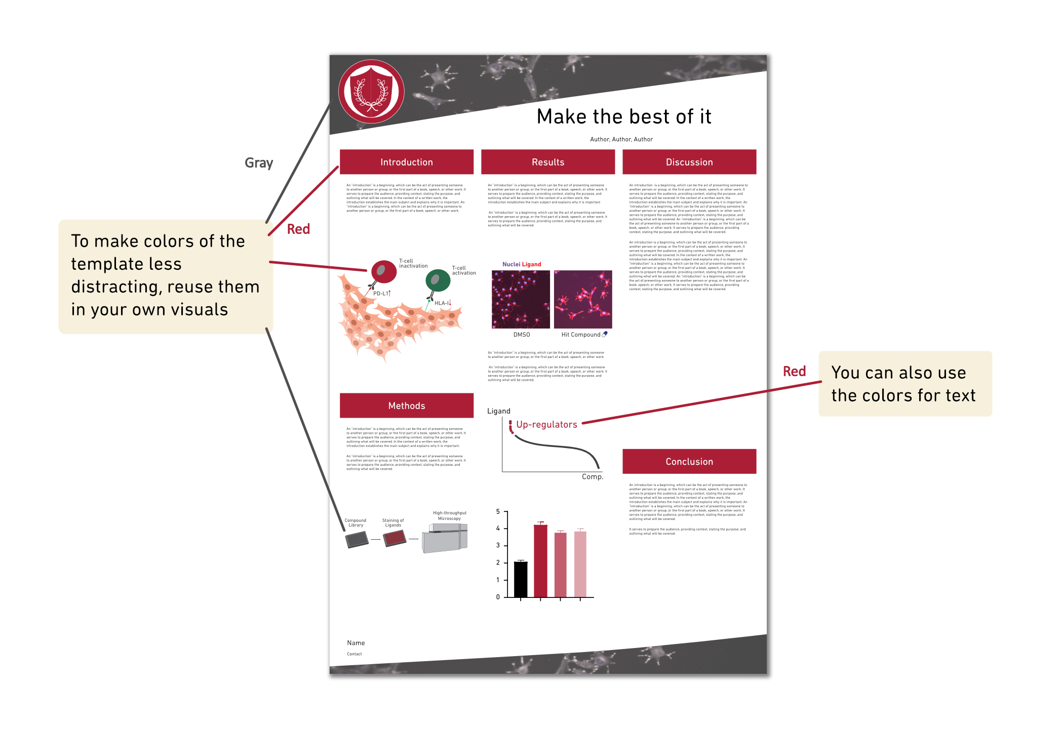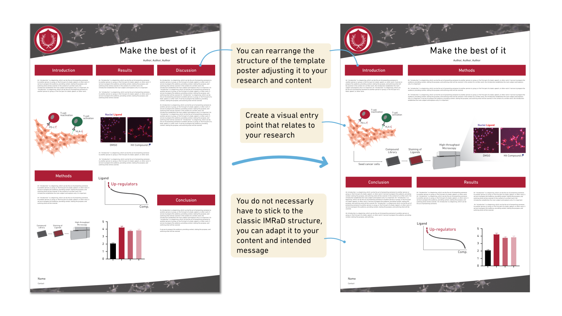 If the template enforces a classic structure like the IMRaD (Introduction, Methods, Results, and Discussion) structure, you might feel forced to present your research in that way. There are many other structures that you could follow, and it’s important to adapt the structure to your content and to the message that you have. Perhaps your poster is only describing your experimental methods or a specific part of a project that does not yet have results. Or maybe your poster will be shown to an audience that needs no classic introduction to the topic. No matter what, you should always adapt the structure to your content and intended story, even when using a template.