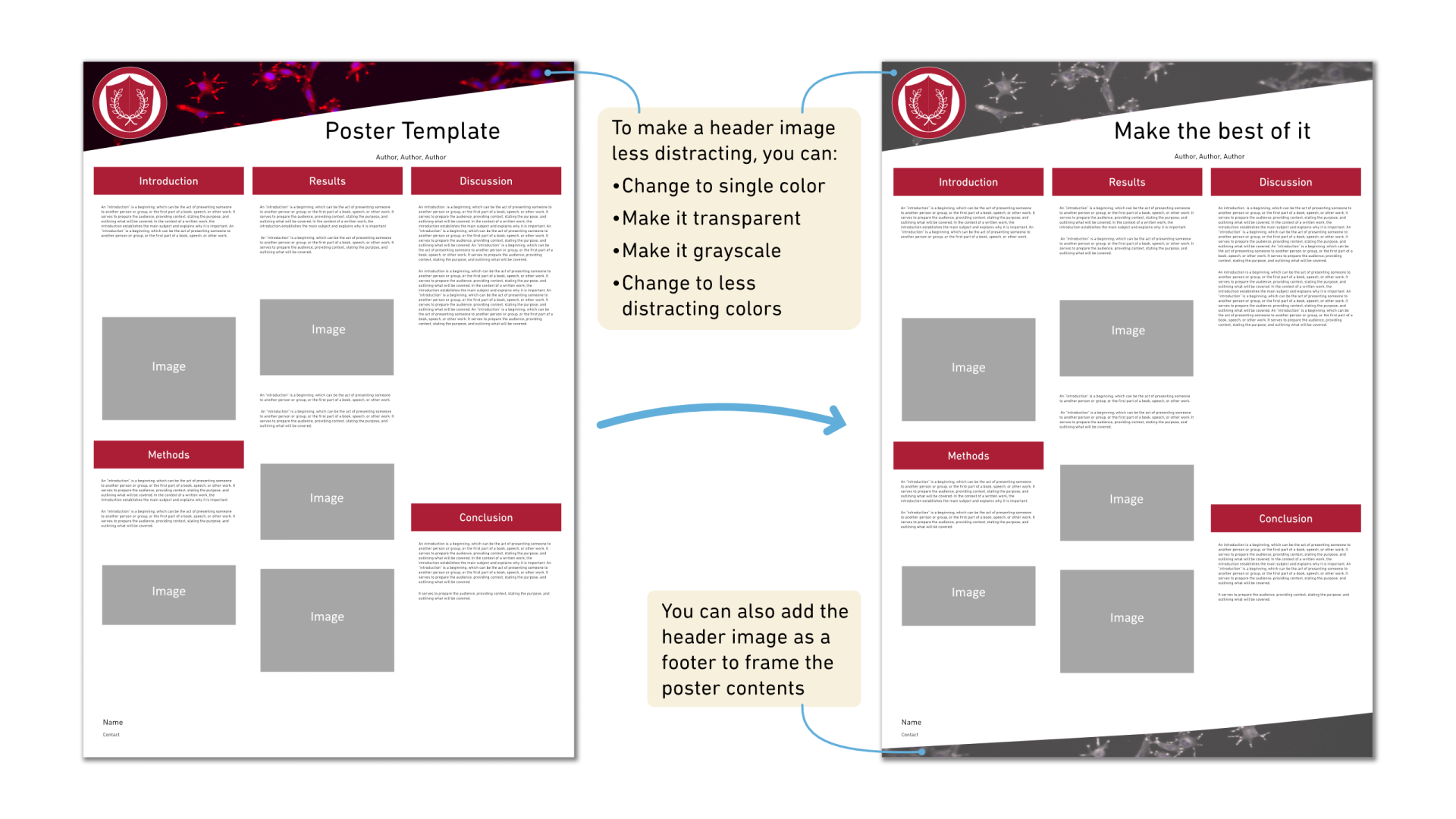 Some universities have poster templates that have an interesting-looking photo or a striking 3D image as the background of the header or the footer for the poster. This is probably put there to make the poster look interesting and stand out compared to other posters. While it might be effective in that, it does not do anything more than just stand out. It might even distract readers from the content of your poster, which is far more important than an image that is simply there to draw attention or to unify a poster in the style of your university.